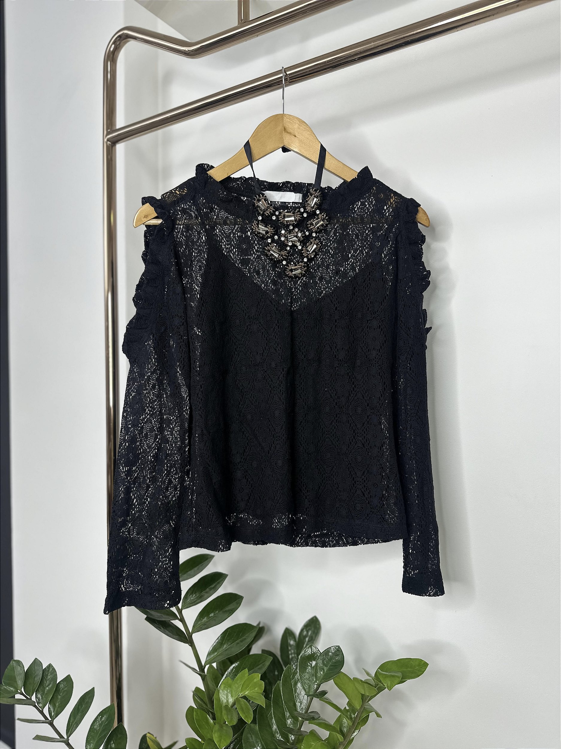 A blusa de renda Dianna é uma peça delicada e sofisticada, ideal para diversas ocasiões. Geralmente confeccionada em tecido leve e transparente, a renda traz um toque romântico e elegante. As mangas presenta detalhes como babados, transparências e recortes.