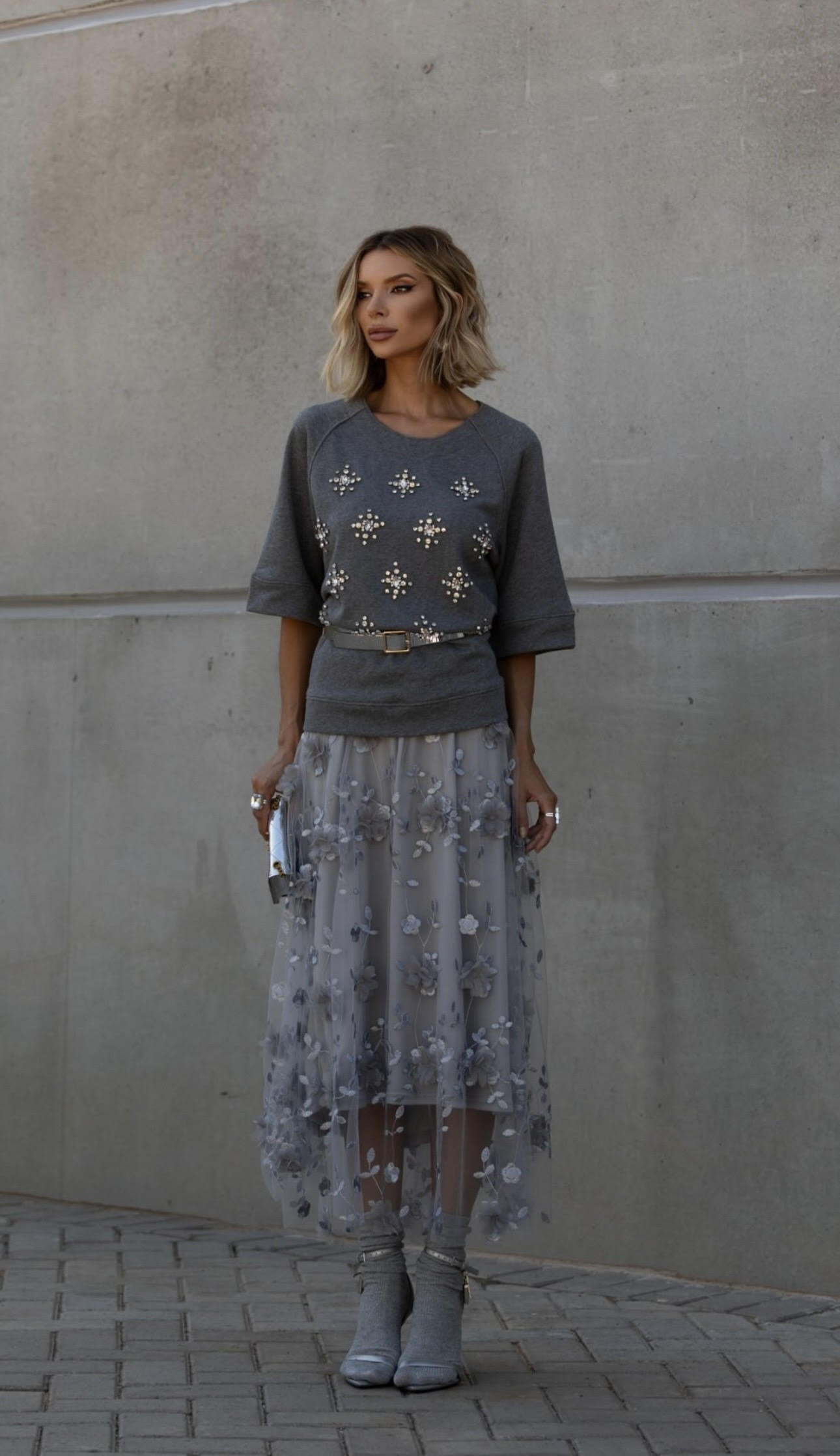 Saia longa de tule feminina, bordado de flores, cor sólida, saia midi de malha de cintura alta