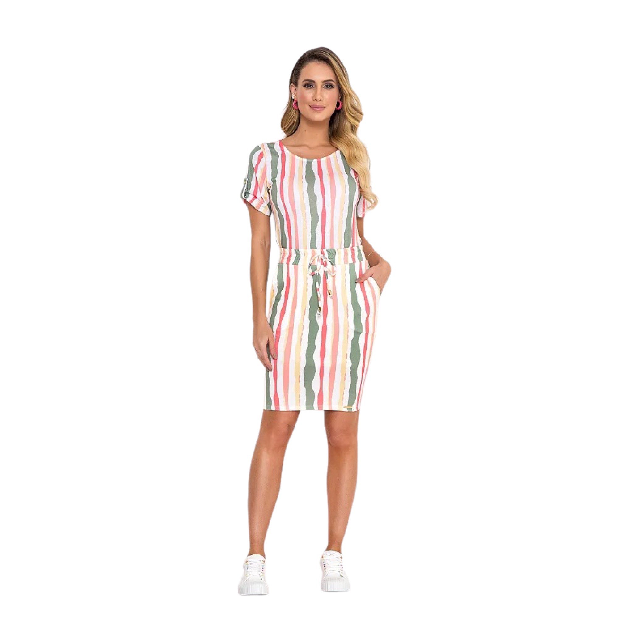 A Saia é elaborada em Malha com estampa exclusiva colorida listrada e desconstruída, em cor de fundo Branco. Um clássico da moda feminina vem repaginado com cores alegres e modernas.