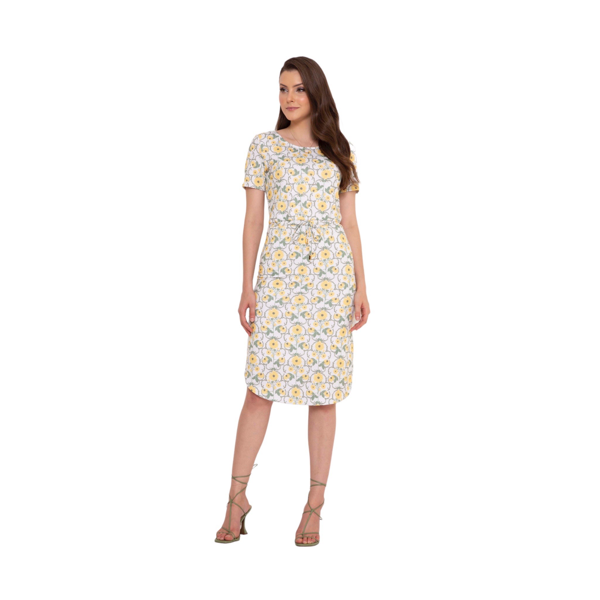 Elaborado em Malha com estampa Floral em tom de fundo Off White, o vestido é sem dúvidas um dos favoritos de nossa coleção. Sua modelagem Reta veste de maneira confortável e macia ao toque e tendo amarração ajustável na cintura, você pode deixar sua silhueta mais modelada e delicada. Apresenta 110 centímetros de comprimento e forro para sua comodidade. Conta com aviamentos em Dourado e pespontos em cor de linha Palha.